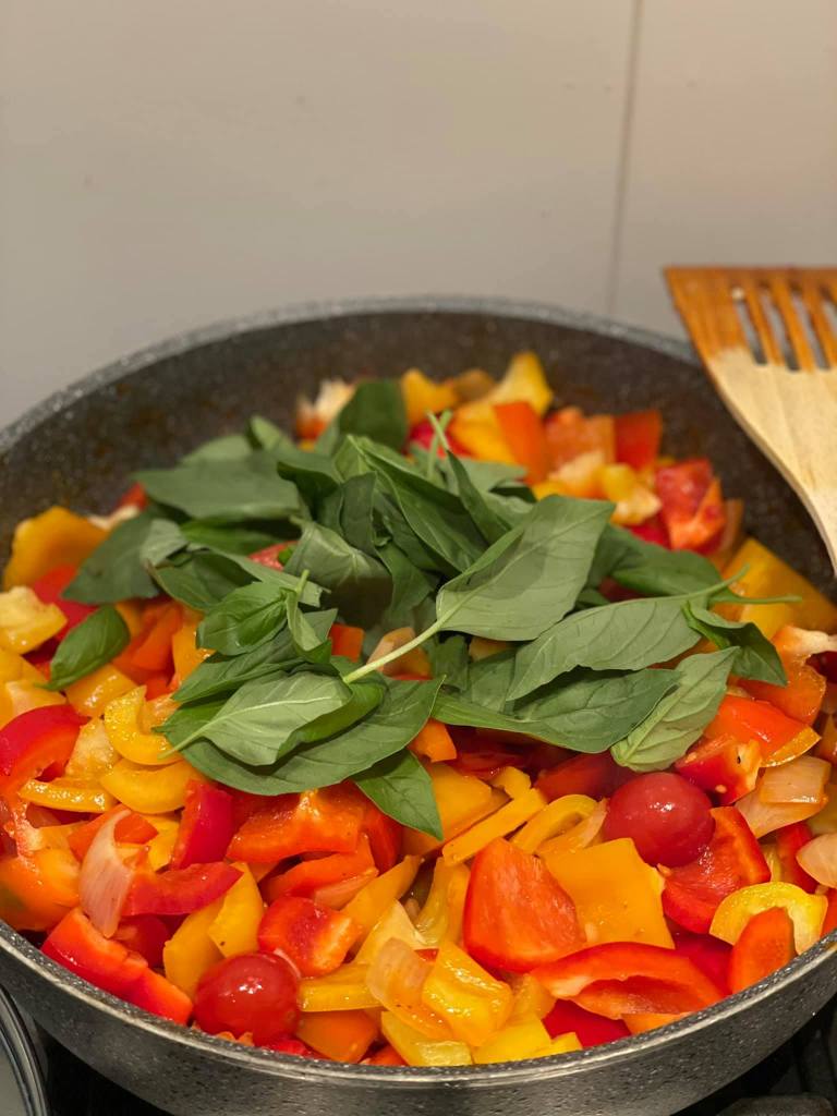 Pluk een flinke volle hand met basilicumblaadjes en scheur deze in grove stukken (niet te zuinig mee doen mensen). Hou iets achter de hand van de basilicum voor de garnering en doe de rest van de basilicum in de pan bij de paprika’s en roer even om.