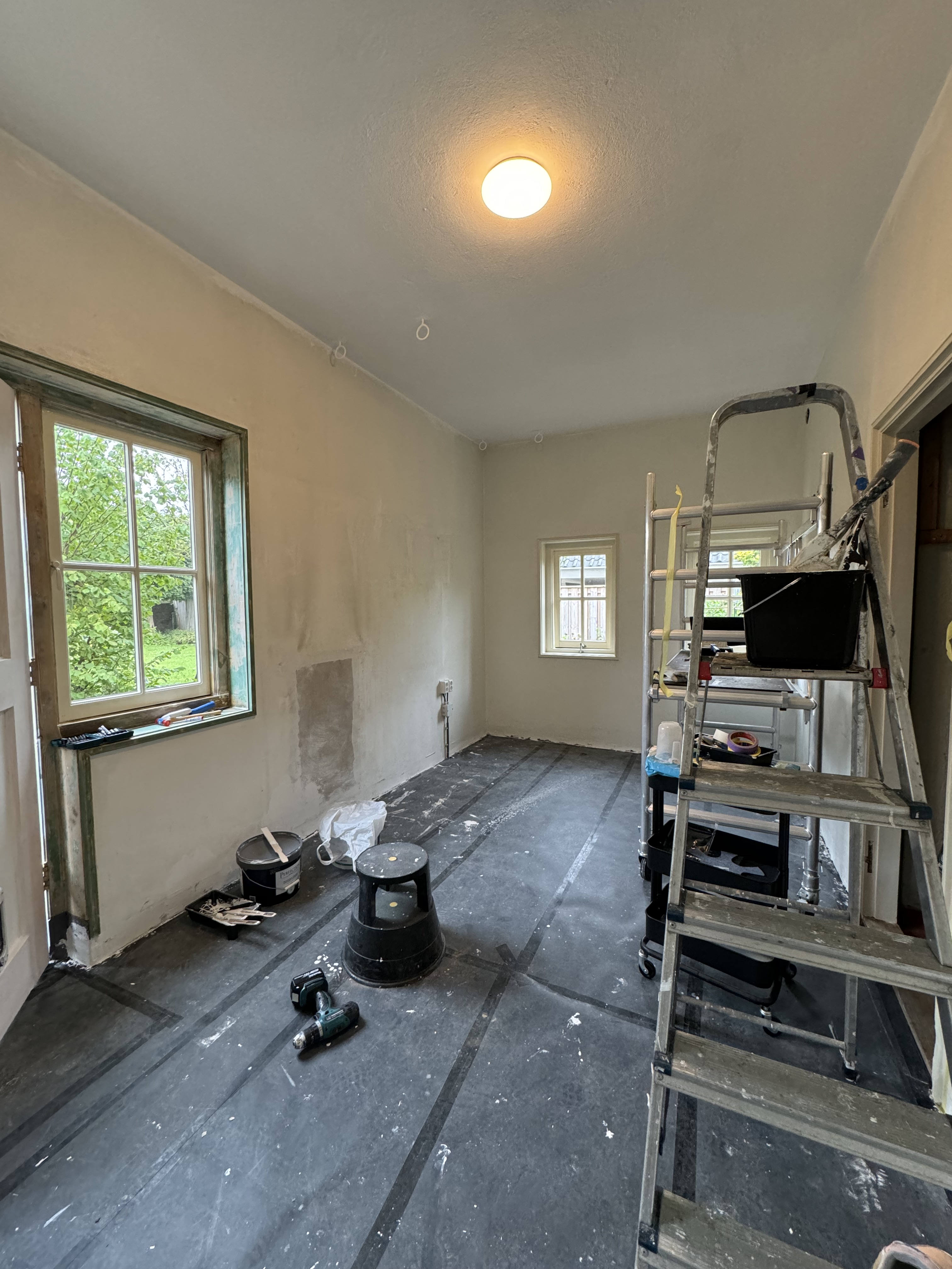 Dus hebben Danny en ik in de zomer van 2024 de bijkeuken en de keuken afgemaakt: verf krabben, schuren, twee nieuwe kozijnen laten plaatsen, verven, behangen, details toevoegen – en jawel, er liggen voor een groot gedeelte plinten!